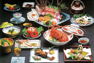 宿の一番の自慢は温泉です。展望大浴場・展望露天風呂からも三河湾を見渡す事ができます。「花の湯」という名前の貸切風呂もあり、1時間3,780円でご利用可能です。お客様のご希望により、湯舟にバラや蘭の花などを浮かべてのご入浴も可能です。(要予約・有料)宴会料理は食材にこだわり、三河湾で獲れた新鮮な魚介類を中心にした会席料理をお出ししております。