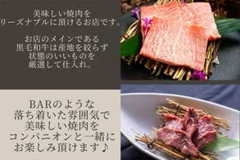 BARのような落ち着いた雰囲気で美味しい焼肉をコンパニオンと一緒にお楽しみ頂けます!